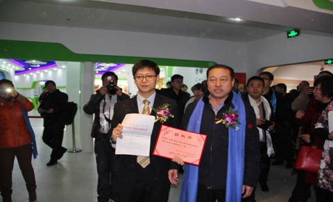 內(nèi)蒙古農(nóng)牧業(yè)產(chǎn)業(yè)化龍頭企業(yè)協(xié)會(huì)執(zhí)行會(huì)長(zhǎng)林永亮為上海精品館館長(zhǎng)杜勇頒發(fā)授權(quán)書