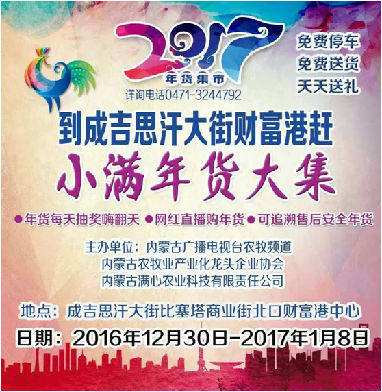 1230日,經(jīng)過精心籌備策劃的內(nèi)蒙古廣播電視臺農(nóng)牧頻道小滿年貨大集終于精彩亮相青城與廣大市民群眾見面了。年貨大集現(xiàn)場,140家參展企業(yè)上千種產(chǎn)品競相亮相,本次活動由內(nèi)蒙古農(nóng)牧業(yè)產(chǎn)業(yè)化龍頭企業(yè)協(xié)會攜手內(nèi)蒙古廣播電視臺農(nóng)牧頻道和內(nèi)蒙古滿心農(nóng)業(yè)科技有限責(zé)任公司共同打造,搭建一個展示企業(yè)形象、宣傳地方產(chǎn)品、溝通產(chǎn)銷渠道、擴(kuò)大消費(fèi)需求、活躍節(jié)日市場的經(jīng)濟(jì)平臺,營造溫馨舒適、品種齊全、質(zhì)優(yōu)價廉、安全可靠、熱鬧紅火的節(jié)日購物氛圍,讓全區(qū)老百姓不用東奔西走就能購買到內(nèi)蒙古的新鮮蔬菜、瓜果、乳肉、糧油等特色農(nóng)畜產(chǎn)品,采購到豐富的鄉(xiāng)土年貨、進(jìn)口食品、日用副食等,豐富首府百姓的菜籃子。