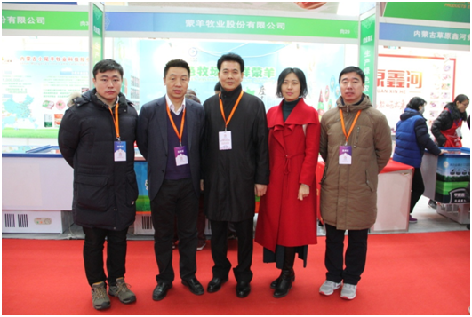 中國農(nóng)業(yè)產(chǎn)業(yè)化龍頭企業(yè)協(xié)會副秘書長李現(xiàn)洲(中)與協(xié)會會長閆樹春、常務秘書長劉俊青在蒙羊牧業(yè)展位前合影