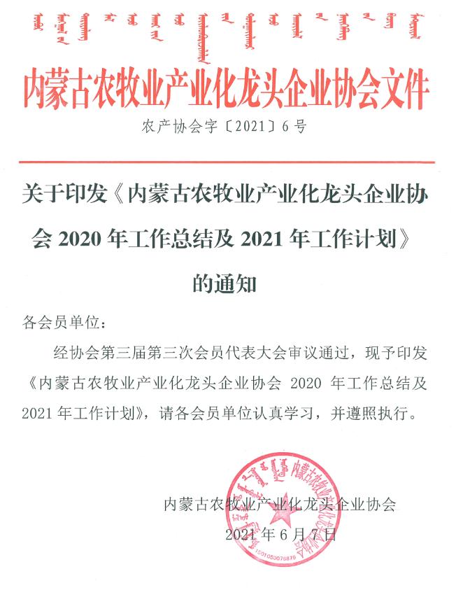 標題:關(guān)于印發(fā)《內(nèi)蒙古農(nóng)牧業(yè)產(chǎn)業(yè)化龍頭企業(yè)協(xié)會2020年工作總結(jié)及2021年工作計劃》的通知
