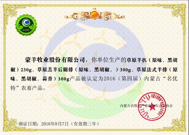 蒙羊牧業(yè)股份有限公司于2012年5月注冊成立,注冊資本3.1億元。成立至今,蒙羊牧業(yè)已布局完成了包含優(yōu)質(zhì)肉羊良種繁育、生態(tài)規(guī)?;N養(yǎng)殖、標準化生產(chǎn)深加工、全程冷鏈物流體系、全國終端渠道覆蓋在內(nèi)的綠色生態(tài)全產(chǎn)業(yè)鏈,并以規(guī)模化、標準化、產(chǎn)業(yè)化的發(fā)展模式以及全新互聯(lián)網(wǎng)思維的整合融入,一躍成為了農(nóng)業(yè)產(chǎn)業(yè)化國家重點龍頭企業(yè)、世界肉類組織成員、自治區(qū)扶貧龍頭開發(fā)企業(yè)、中國肉類協(xié)會常務理...