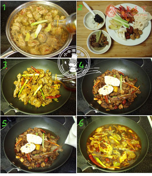 1、水燒開加入蔥白、生姜、料酒,放入羊肉塊,汆燙幾分鐘,撈出羊肉洗凈血水;