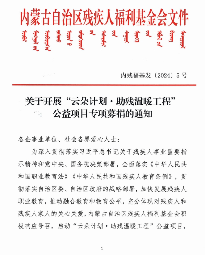 關于開展“云朵計劃·助殘溫暖工程’公益項目專項募捐的通知