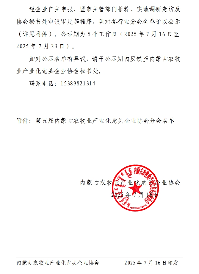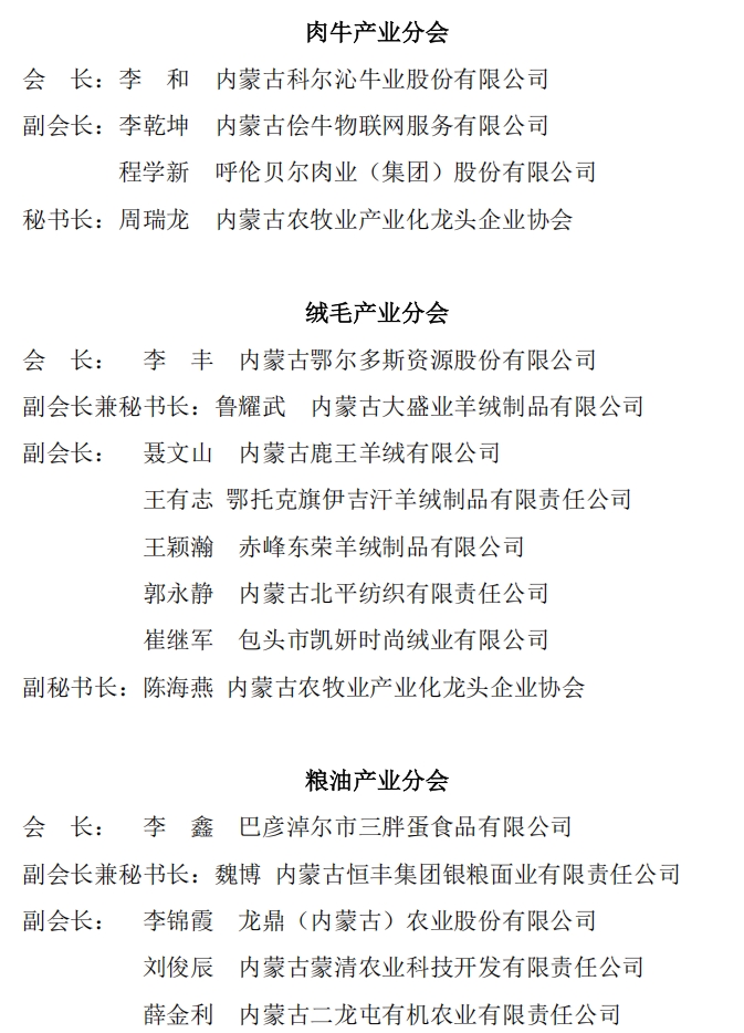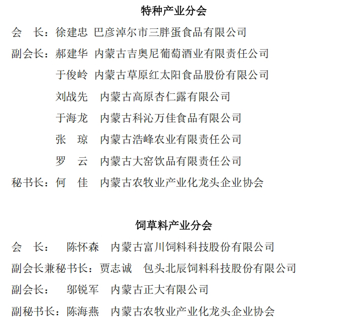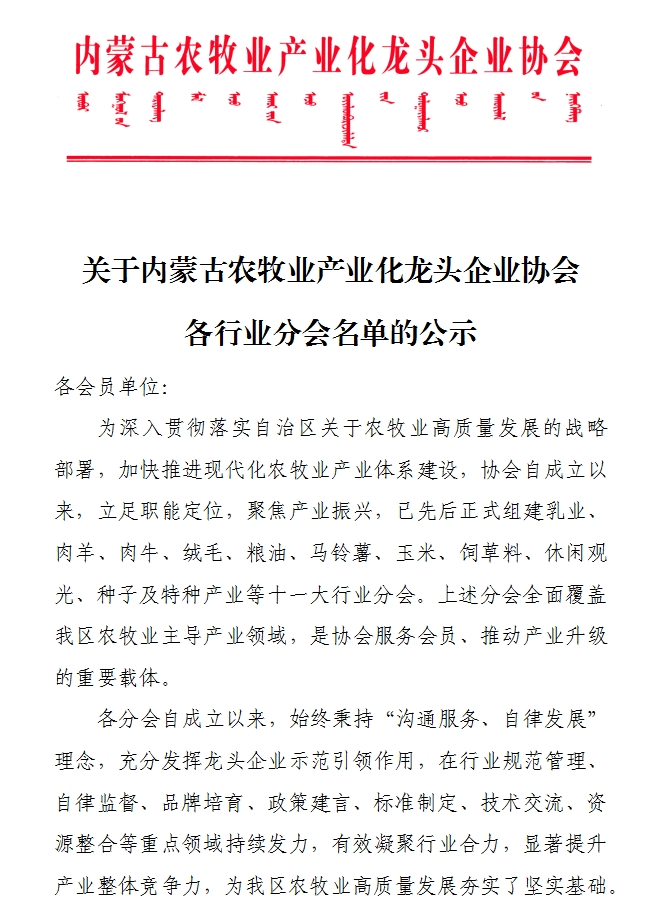 關(guān)于內(nèi)蒙古農(nóng)牧業(yè)產(chǎn)業(yè)化龍頭企業(yè)協(xié)會各行業(yè)分會名單的公示