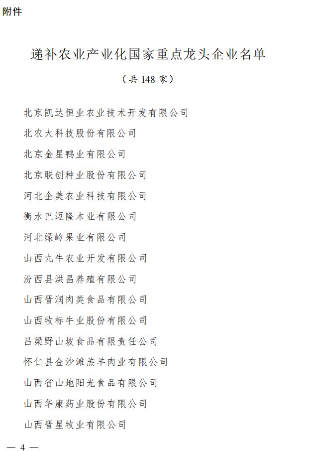 根據(jù)《農(nóng)業(yè)產(chǎn)業(yè)化國家重點(diǎn)龍頭企業(yè)認(rèn)定和運(yùn)行監(jiān)測(cè)管理辦法》(農(nóng)經(jīng)發(fā)〔20181號(hào))規(guī)定,對(duì)國家重點(diǎn)龍頭企業(yè)實(shí)行動(dòng)態(tài)管理,每?jī)赡赀M(jìn)行一次監(jiān)測(cè)評(píng)估,做到有進(jìn)有出、等額遞補(bǔ)。2018年,全國農(nóng)業(yè)產(chǎn)業(yè)化聯(lián)席會(huì)議八部門聯(lián)合開展了第八次國家重點(diǎn)龍頭企業(yè)監(jiān)測(cè)工作,各?。▍^(qū)、市)和新疆生產(chǎn)建設(shè)兵團(tuán)按要求,嚴(yán)格規(guī)范、公平公正推薦遞補(bǔ)企業(yè),經(jīng)專家評(píng)審、聯(lián)席會(huì)議審定和媒體公示,決定遞補(bǔ)北京凱達(dá)恒業(yè)農(nóng)業(yè)技術(shù)開發(fā)有限公司等148家企業(yè)為農(nóng)業(yè)產(chǎn)業(yè)化國家重點(diǎn)龍頭企業(yè)。