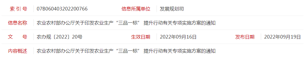標題:農(nóng)業(yè)農(nóng)村部辦公廳關于印發(fā)農(nóng)業(yè)生產(chǎn)“三品一標” 提升行動有關專項實施方案的通知