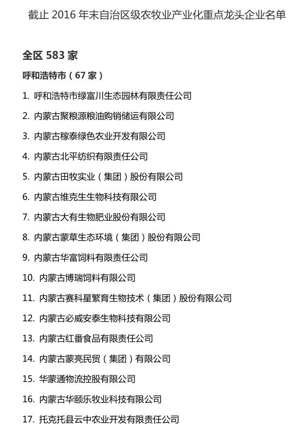 企業(yè)名稱:截止2016年末自治區(qū)級(jí)農(nóng)牧業(yè)產(chǎn)業(yè)化 重點(diǎn)龍頭企業(yè)名單​