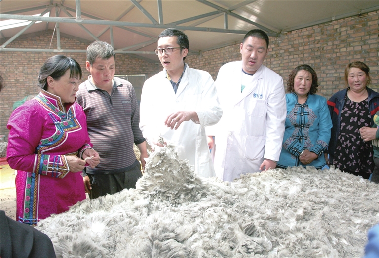 纖維檢驗(yàn)技術(shù)專家向牧民講授羊毛分選知識。