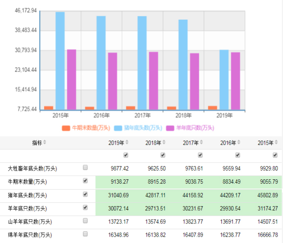 全國(guó)2015-2019年牛、羊、豬期末存欄情況