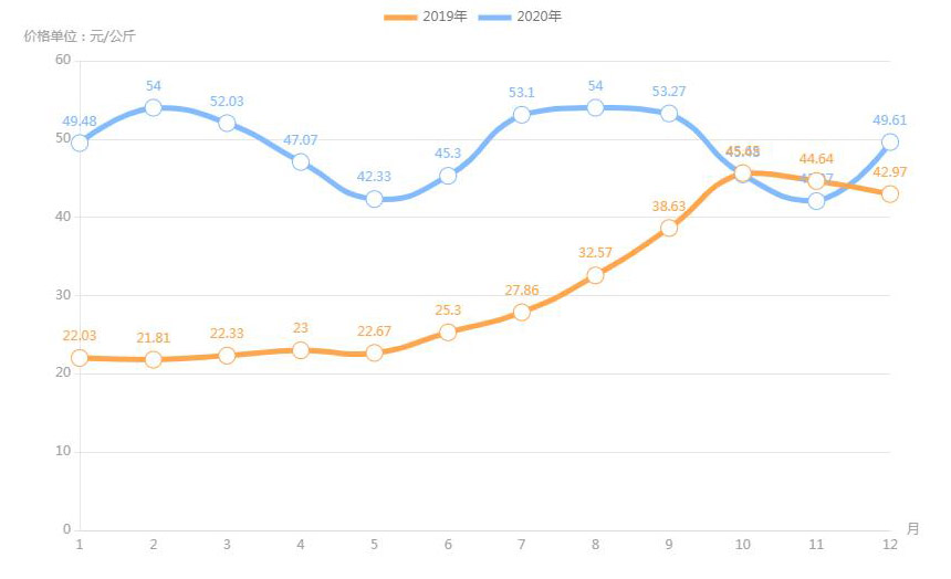 豬肉(白條豬)最高價(jià)格出現(xiàn)在2020年12月40.79元/公斤,最低價(jià)格出現(xiàn)在2019年2月13.67元/公斤。