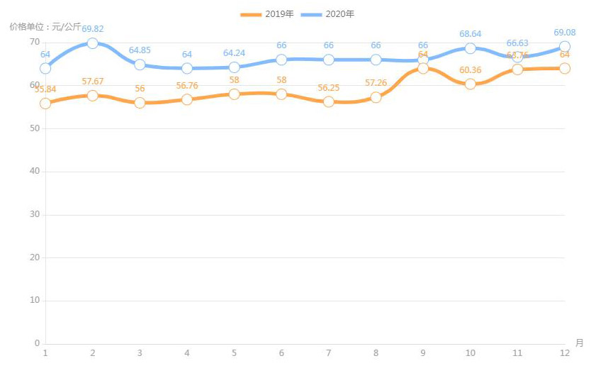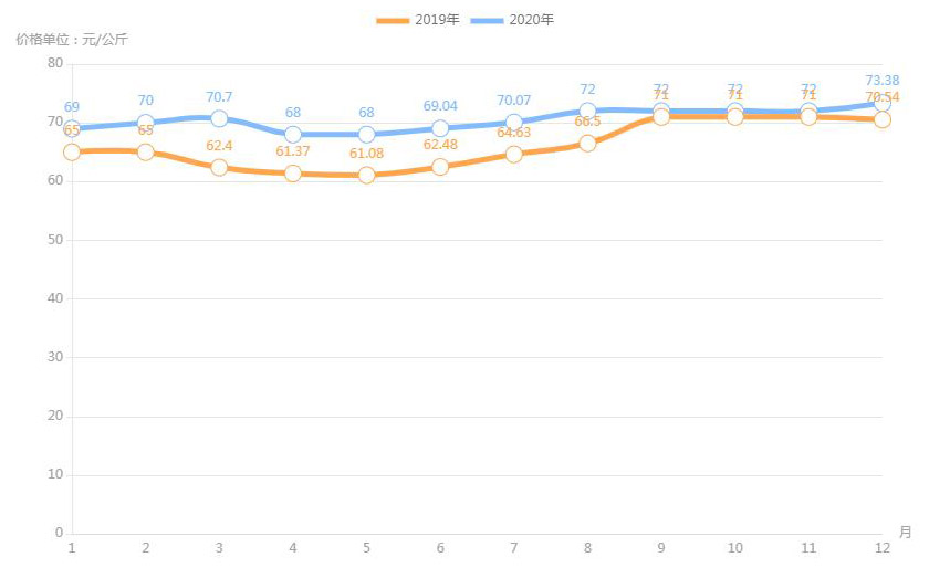 對(duì)內(nèi)蒙古幾大農(nóng)貿(mào)批發(fā)市場(chǎng)羊肉價(jià)進(jìn)行匯總分析得出:呼和浩特市內(nèi)蒙古美通農(nóng)產(chǎn)品批發(fā)市場(chǎng)羊肉最高價(jià)格出現(xiàn)在2020年11月68元/公斤,最低價(jià)格出現(xiàn)在2019年4月52元/公斤。呼和浩特市東瓦窯批發(fā)市場(chǎng)羊肉最高價(jià)格出現(xiàn)在2020年12月73.38元/公斤,最低價(jià)格出現(xiàn)在2019年5月61.08元/公斤。包頭市友誼蔬菜批發(fā)市場(chǎng)羊肉最高價(jià)格出現(xiàn)在2020年12月67.16元/公斤,最低價(jià)格出現(xiàn)在2019年3月54元/公斤。內(nèi)蒙古赤峰西城市場(chǎng)羊肉最高價(jià)格出現(xiàn)在2019年9月75.52元/公斤,最低價(jià)格出現(xiàn)在2019年3月56.97元/公斤。羊肉價(jià)格和去年同期相比整體上漲,漲幅基本在每公斤5-15元左右。