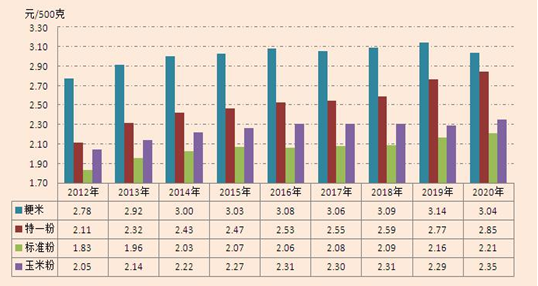 6   內(nèi)蒙古自治區(qū)20122020年主要成品糧零售價(jià)格對比圖