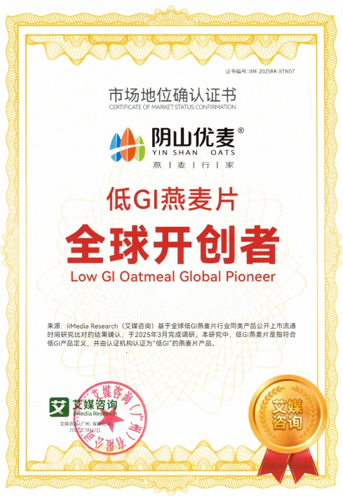 陰山優(yōu)麥此次發(fā)布的新品低GI燕麥片,是其深耕健康食品領(lǐng)域的又一力作。新品不僅通過專業(yè)機構(gòu)檢測認證,獲得“低GI食品認證”,同時陰山優(yōu)麥還獲得了“低GI燕麥片全球開創(chuàng)者”市場地位確認證書。